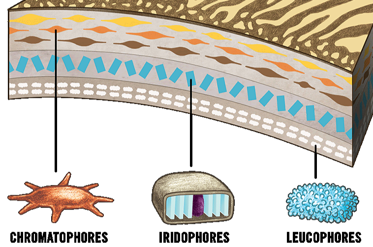 Color changes are the result of specialized cell structures interacting with ambient light from the environment.Chromatophore Cell Types: