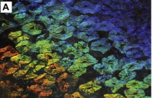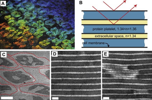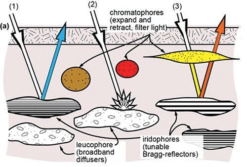 - Leucophores contain spherical reflectin protein assemblages that scatter light equally well in all directions (ie, diffusion / white light)