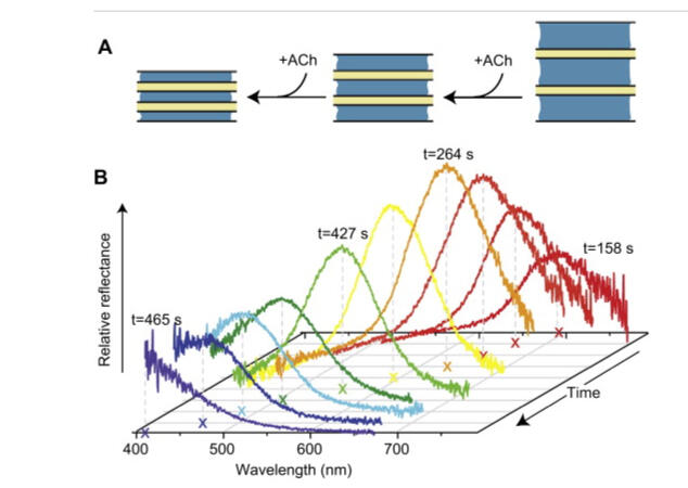 Increasing acetylcholine concentration causes the cells to stack more tightly which alters the reflectance of the iridophore.