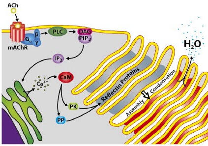 Reflective structures are made up of proteins called Reflectin.Reflectin changes its density upon condensation and the cells use this to turn on/off iridophores.