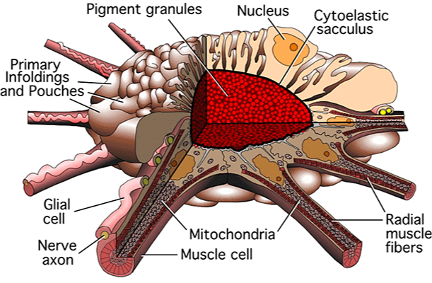Pigment-containing chromatophores have around 20 radial muscle fibers. These cells unfold fast (milliseconds).